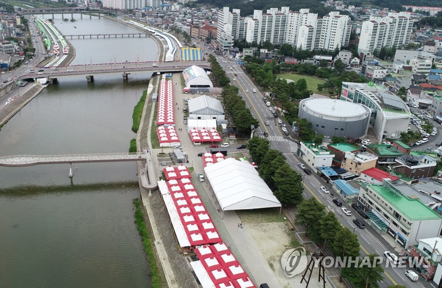 (강릉=연합뉴스) 유형재 기자 = 강릉단오제 개막을 나흘 앞둔 14일 강릉시 남대천 단오장 일원에 천막이 들어서는 등 준비가 한창이다.