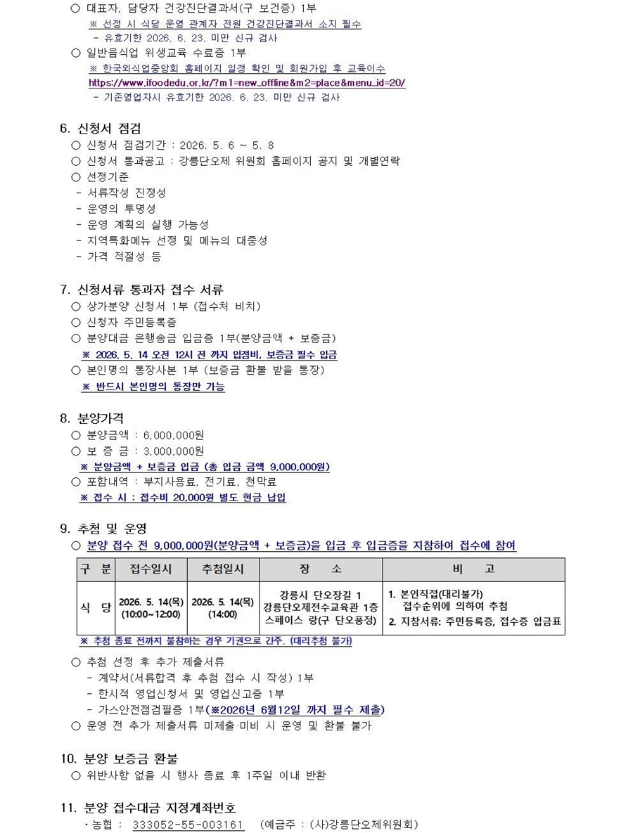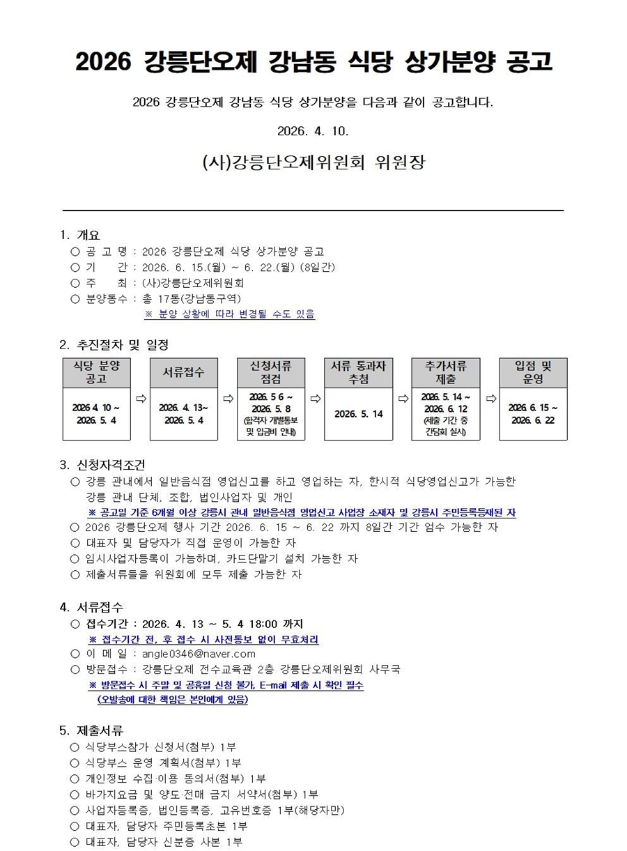 2026 강릉단오제 강남동구역 분양공고 (식당)