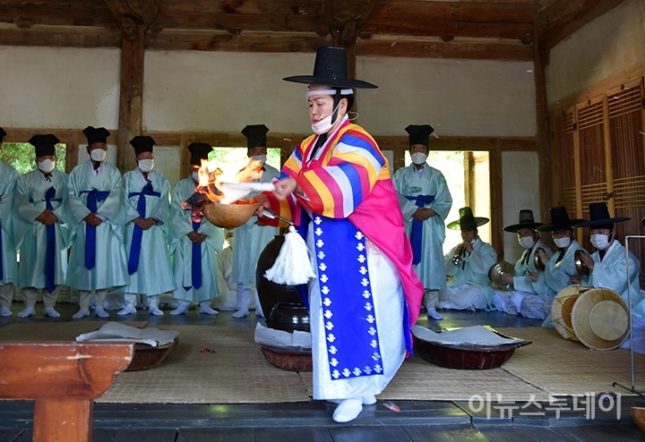 [이뉴스투데이 강원취재본부 어경인 기자] 27일 강원 강릉시 칠성당에서 유네스코 세계무형문화유산이자 중요무형문화재 제13호인 강릉단오제의 시작을 알리는 '신주빚기 행사'가 열린 가운데 신주 빚기에 앞서 무녀가 신주가 부정을 타지 않도록 기원하는 굿을 하고 있다.