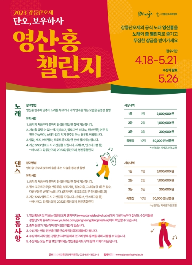 영산홍 댄스 챌린지의 경우 강릉단오제를 상징하는 포인트 안무인 영산홍꽃 춤, 널뛰기 춤, 길놀이 춤, 그네 춤 가운데 1개는 필수로 포함해야 한다.