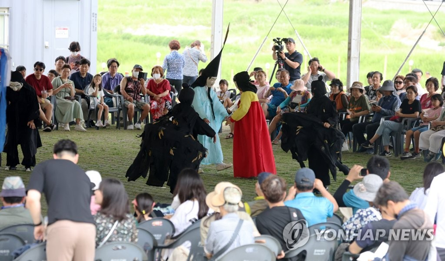(강릉=연합뉴스) 유형재 기자 = 18일 천년 축제 강릉단오제가 개막한 가운데 강릉 남대천 단오장에서 관노가면극이 신명나게 펼쳐지고 있다. 2023.6.18