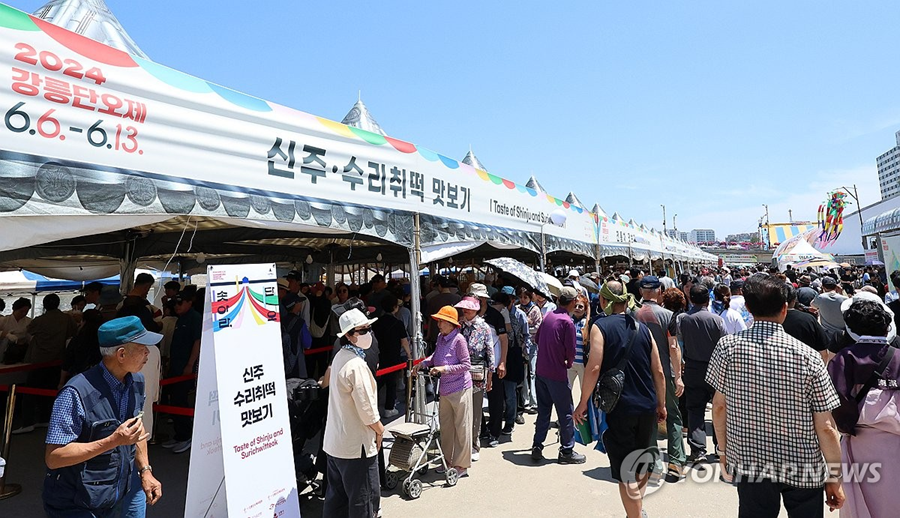 단오를 하루 앞둔 9일 천년 축제이자 유네스코 인류무형문화유산인 강릉단오제가 열리고 있는 강릉시 남대천 단오장에서 관람객들이 수리취떡과 신주를 맛보기 위해 길게 줄을 서 차례를 기다리고 있다.