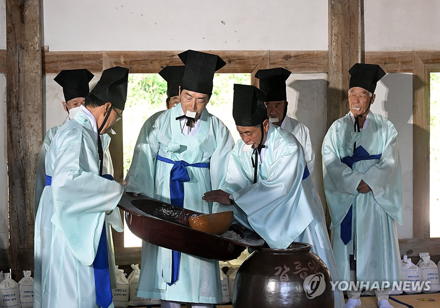 (강릉=연합뉴스) 유형재 기자 = 2025 강릉단오제에 쓰일 술인 신주를 빚는 데 필요한 쌀을 십시일반 정성으로 모으는 신주미 봉정에 역대 최대의 쌀이 모였다.