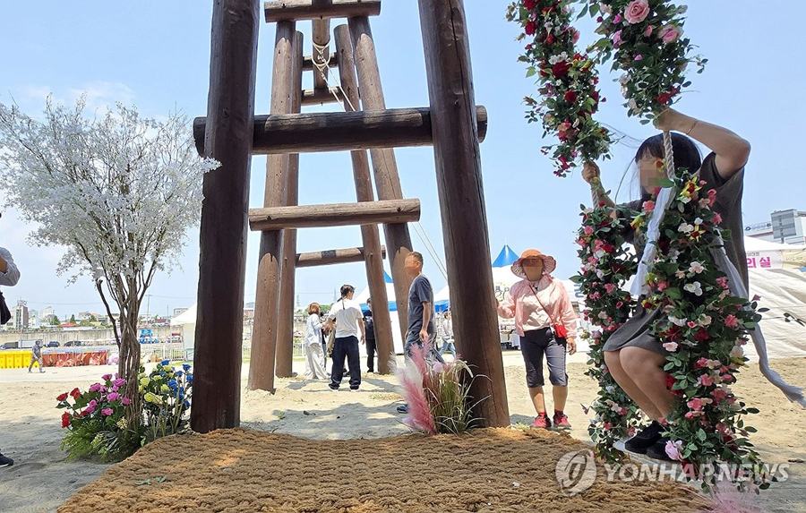 (강릉=연합뉴스) 유형재 기자 = 유네스코 인류무형문화유산이자 국가무형유산인 천년 축제 '강릉단오제' 첫날인 27일 강원 강릉시 남대천 단오장에서 시민들이 꽃 그네를 즐기고 있다.