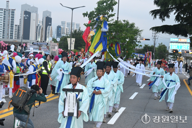 천년 축제이자 유네스코 인류무형문화유산인 강릉단오제의 대표 콘텐츠 가운데 하나인 신통대길 길놀이가 29일 강릉 시내부터 단오장까지 잇는 1.5㎞ 구간에서 열려 강릉단오제의 주신을 단오장 내 굿당으로 모시는 영신행차를 하고 있다.